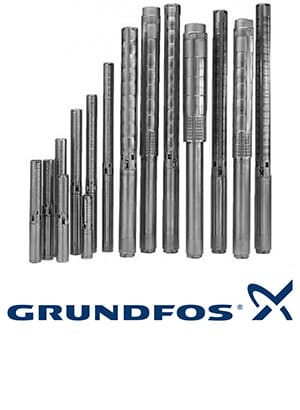 - A range of Grundfos submersible borehole pumps in various sizes, featuring the Grundfos logo.