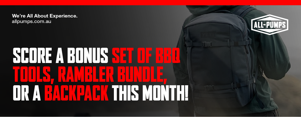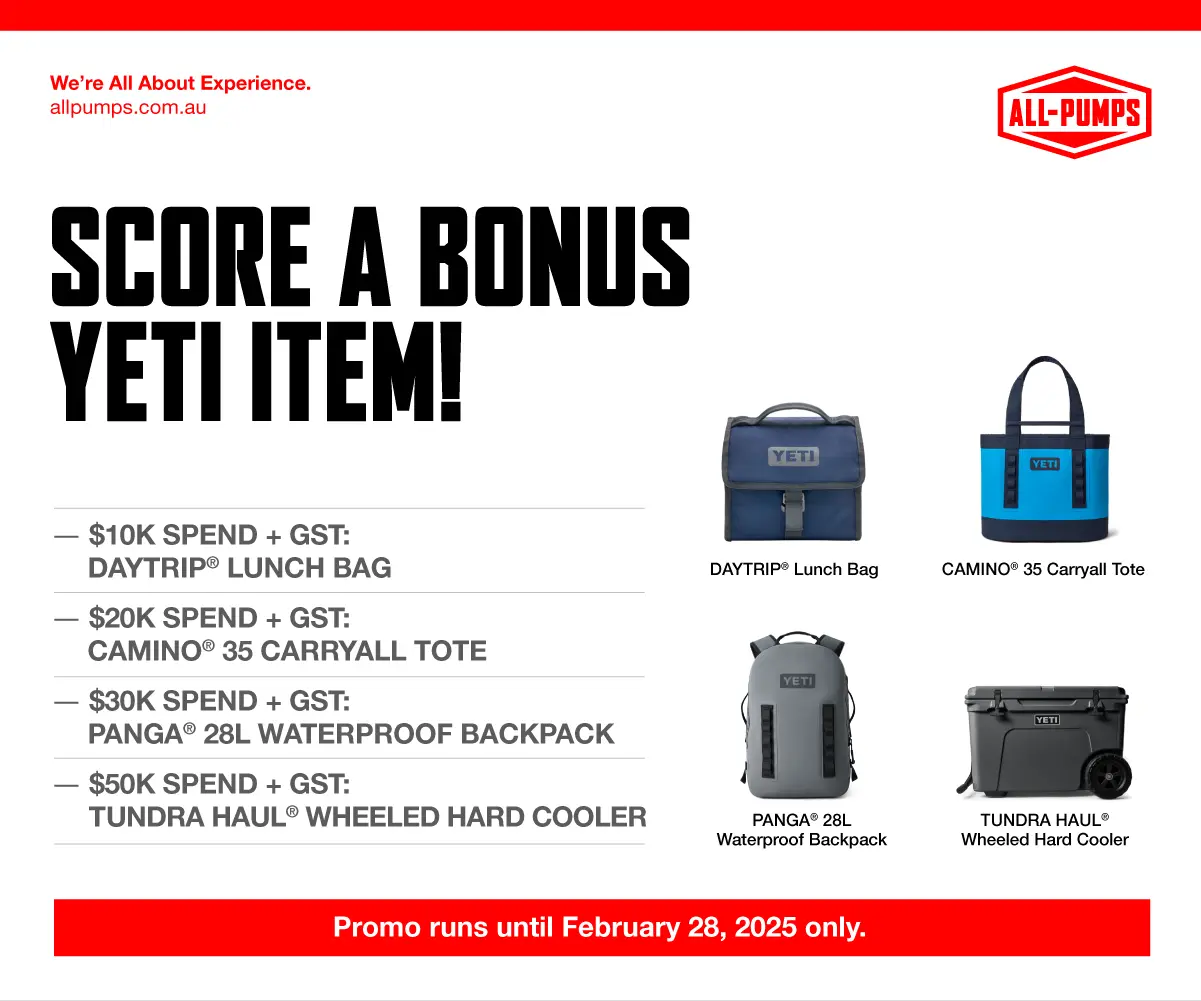 Earn exclusive rewards this October with All-Pumps! Spend $10K, $20K, or $30K + GST on orders and receive premium gifts like a Le Creuset BBQ Tool Set, a YETI Rambler Bundle, or a YETI Crossroads Backpack. Promo ends October 31, 2025.