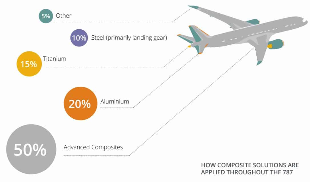 Composite materials have been used extensively in the space shuttle, military defences, civil structures (such as bridges), and more recently, 50% of the construction of the 787 Dreamliner.