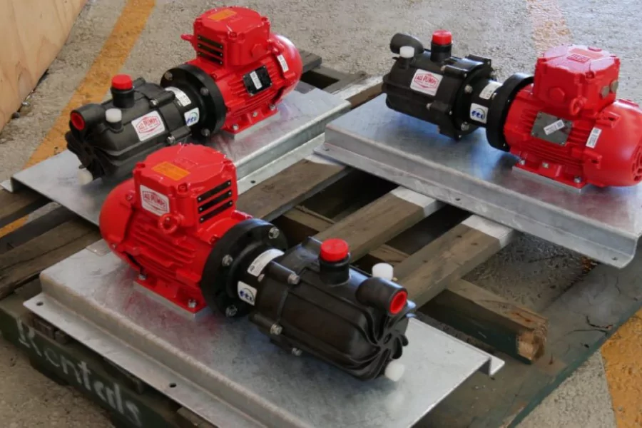 The Finish Thompson Self Priming Magnetic Drive pumps allow the chemicals to be drawn from up to 4 metres below. The magnetic drive eliminates the risk of seal failure and keeps the chemical completely contained from the atmosphere. Magnetic drive pumps are the safest and most reliable way to transfer bulk chemicals.