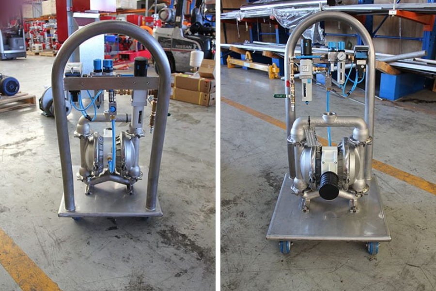 All Pumps supplied a set of P4 Wilden stainless pumps mounted on trolleys with custom control systems that included air operated timers for timed transfers and automation. As these pumps are installed on CIP proof trolleys, they are easily portable and durable.
